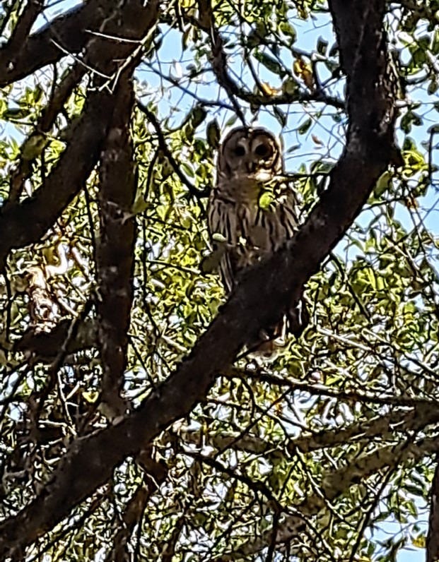 The next day, I heard it again. This time I made a calmer approach and it stayed where it was: a barred owl perched on a branch overhead. It stayed there all day, calling back and forth to another owl somewhere nearby.